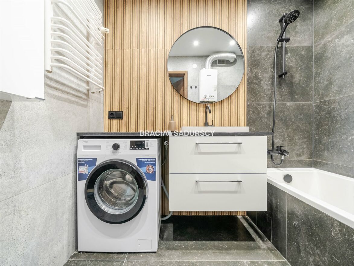 Wyposażenie łazienki: wanna, umywalka, pralka, natrysk, lustro |